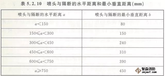5.2.10 當(dāng)噴頭安裝在不到頂?shù)母魯喔浇鼤r,噴頭與隔斷的水平距離和最小垂直距離應(yīng)符合表5.2.10的規(guī)定(見圖5.2.10)。