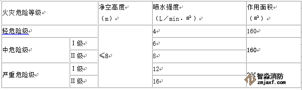 應(yīng)符合下表的要求。僅在走道設(shè)置單排閉式噴頭的閉式系統(tǒng),其作用面積應(yīng)按最大疏散距離所對(duì)應(yīng)的走道面積確定;裝有網(wǎng)格、柵板類通透性吊頂噴水強(qiáng)度應(yīng)按規(guī)定值的1.3倍確定;干式系統(tǒng)的作用面積按規(guī)定值的1.3倍確定。系統(tǒng)最不利點(diǎn)處噴頭的工作壓力不應(yīng)低于0.05Mpa,靜壓不應(yīng)小于0.10MPa。