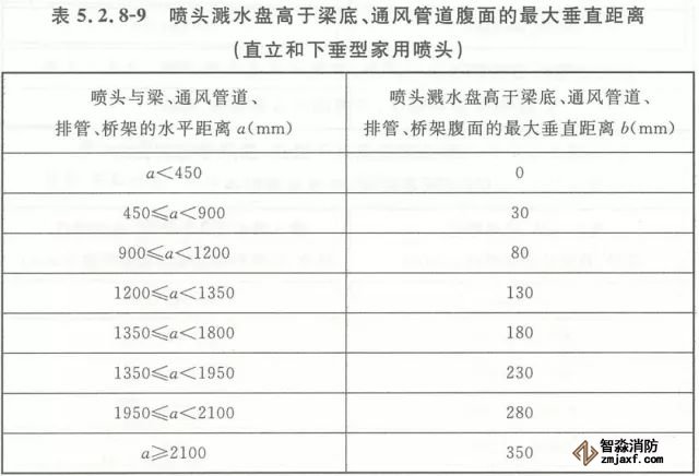 5.2.8 當(dāng)噴頭濺水盤(pán)高于附近梁底或高于寬度小于1.2m的通風(fēng)管道、排管、橋架腹面時(shí),噴頭濺水盤(pán)高于梁底、通風(fēng)管道、排管、橋架腹面的最大垂直距離應(yīng)符合表5.2.8-1~表5.2.8-9的規(guī)定(見(jiàn)圖5.2.8)。