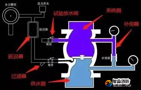 1、濕式報(bào)警閥結(jié)構(gòu)中名稱如圖所示,相對(duì)來說比較簡(jiǎn)單。其中延遲器和補(bǔ)償器都是防止管網(wǎng)內(nèi)水流波動(dòng)導(dǎo)致閥組誤開啟的措施。試驗(yàn)放水閥可以在閥組上開啟后,達(dá)到只開啟閥組而不用運(yùn)轉(zhuǎn)整個(gè)系統(tǒng)來測(cè)試閥組的功能的作用。閥瓣伺應(yīng)狀態(tài)下封閉住報(bào)警管路,當(dāng)閥瓣開啟后,水流流入報(bào)警管路,充滿延遲器,觸動(dòng)壓力開關(guān)、水力警鈴報(bào)警。