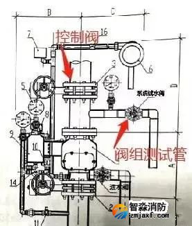 4)圖示路線②為報(bào)警管路測(cè)試管路,只需按照②路線開啟水力警鈴試驗(yàn)閥,即可不開啟閥瓣從而測(cè)試報(bào)警功能。