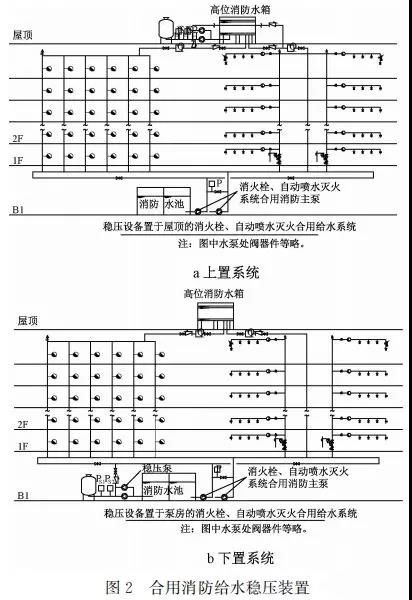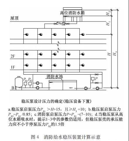 臨時(shí)高壓消防給水系統(tǒng)一般均應(yīng)設(shè)置高位消防水箱(除符合規(guī)范規(guī)定可不設(shè)的情形外),且對(duì)其設(shè)置高度有一定要求。日本規(guī)范規(guī)定自動(dòng)噴水滅火系統(tǒng)屋頂消防水箱最不利的最低供水壓力為0.15 MPa,美國(guó)、英國(guó)規(guī)范則要求0.10 MPa。我國(guó)1987年版和2006年版“建規(guī)”對(duì)比均沒有規(guī)定,只在條文中要求重力自流的消防水箱應(yīng)設(shè)置在建筑的最高部位。1982年版《高層民用建筑設(shè)計(jì)規(guī)范》(以下簡(jiǎn)稱“高規(guī)”)首次提出屋頂消防水箱應(yīng)滿足最不利消火栓的靜水壓力,但沒有提出設(shè)計(jì)參數(shù),1995年版“高規(guī)”做了具體規(guī)定。國(guó)標(biāo)圖集98S205編制目的是為解決臨時(shí)高壓消防給水系統(tǒng)高位消防水箱設(shè)置高度滿足不了系統(tǒng)最不利點(diǎn)靜水壓力時(shí)應(yīng)設(shè)增壓設(shè)施的要求,其為消防專用的增壓穩(wěn)壓設(shè)備的主要功能只是火災(zāi)初期時(shí)、消防主泵啟動(dòng)前,確保具有足夠消防壓力的30 s儲(chǔ)水量進(jìn)行初期火災(zāi)撲救,直至消防主泵全負(fù)荷啟動(dòng)運(yùn)行。這里更多的還是強(qiáng)調(diào)增壓的概念,設(shè)備類似于氣壓供水,發(fā)揮主要作用的是氣壓水罐,穩(wěn)壓水泵的作用是在3 min內(nèi),補(bǔ)足氣壓水罐內(nèi)實(shí)際穩(wěn)壓水容積。利用氣壓水罐所設(shè)定的P1、P2、PS1和PS2運(yùn)行壓力來控制穩(wěn)壓泵運(yùn)行工況。P1為根據(jù)計(jì)算求得消火栓系統(tǒng)或自動(dòng)噴水滅火系統(tǒng)中最不利點(diǎn)所需的消防壓力作為氣壓水罐的充氣壓力。平時(shí)管道系統(tǒng)如有滲漏泄壓等情況,控制穩(wěn)壓水泵不斷補(bǔ)水穩(wěn)壓,在PS1、PS2(啟動(dòng)-停止)反復(fù)運(yùn)行,一旦有火情,管道系統(tǒng)大量缺水,造成PS1下降(PS1→P2),降至P2時(shí),立即啟動(dòng)消防主泵。