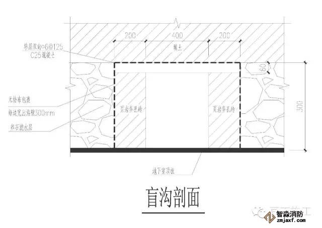 5、在地下室周邊設(shè)置與場地內(nèi)盲溝相連的排水通道,最終將水排入城市雨
