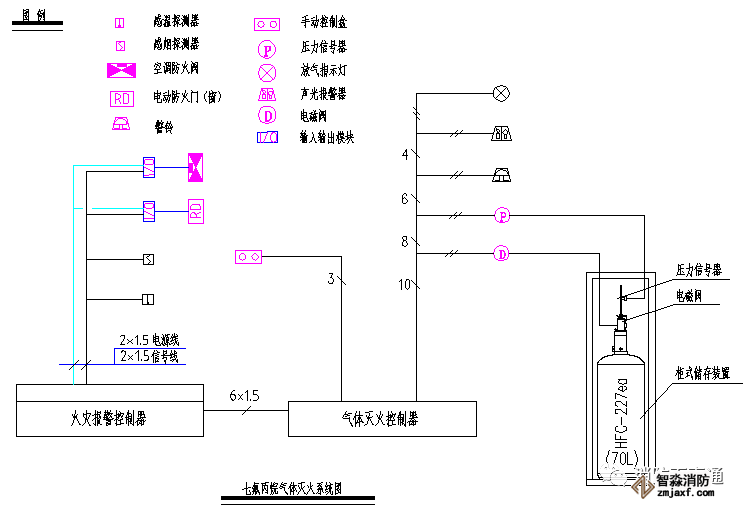下面簡述一下該氣體滅火系統(tǒng)的組成方式,即參照《火災自動報警系統(tǒng)設計規(guī)范》GB50116-2013第4.4.3條,氣體滅火控制器、泡沫滅火控制器不直接連接火災探測器的組成方式,火災報警控制器設置在消防監(jiān)控中心,防護區(qū)設置的感煙探測器和感溫探測器直接連接到消防控制中心的集中報警控制器上,消防控制中心的火災報警控制器通過總線控制模塊聯(lián)動切除空調系統(tǒng)和防火閥,關閉防火卷簾門等;氣體滅火控制器設置在防護區(qū)的鋼瓶組附近,連接防護區(qū)內的聲光報警器和防護區(qū)外的聲光報警器、以及啟動鋼瓶的電磁閥和氣體釋放的壓力開關信號機放氣指示門燈,現(xiàn)場緊急釋放和啟停按鈕設置在防護區(qū)門口。