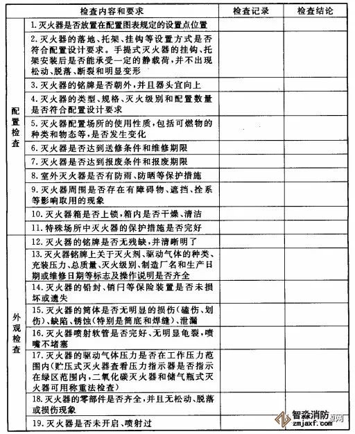 根據(jù)GB50444要求,滅火器的配置、外觀等至少每月檢查一次;對(duì)于候車(機(jī)、船)室、歌舞娛樂(lè)放映游藝等人員密集的公共場(chǎng)所,以及堆場(chǎng)、罐區(qū)、石油化工裝置區(qū)、加油站、鍋爐房、地下室等場(chǎng)所,至少每半月檢查一次,基本檢查內(nèi)容及要求如下: